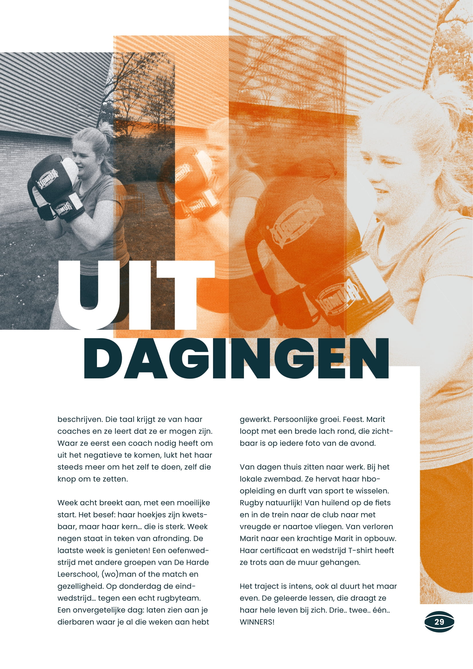 Je hebt geen ervaring of conditie nodig. Alleen de bereidheid om eerlijk naar jezelf te kijken en hard te werken, voor jezelf. Rugby is bij De Harde Leerschool het middel om gedrag zichtbaar te maken en weerbaarheid te ontwikkelen. Hoe reageer je als het spannend wordt, waar ligt je kracht? Daarnaast gebruiken we andere sport en outdooractiviteiten, waarbij winnen of verliezen niet centraal staat. Wat je op het veld leert, werkt door in het dagelijks leven.